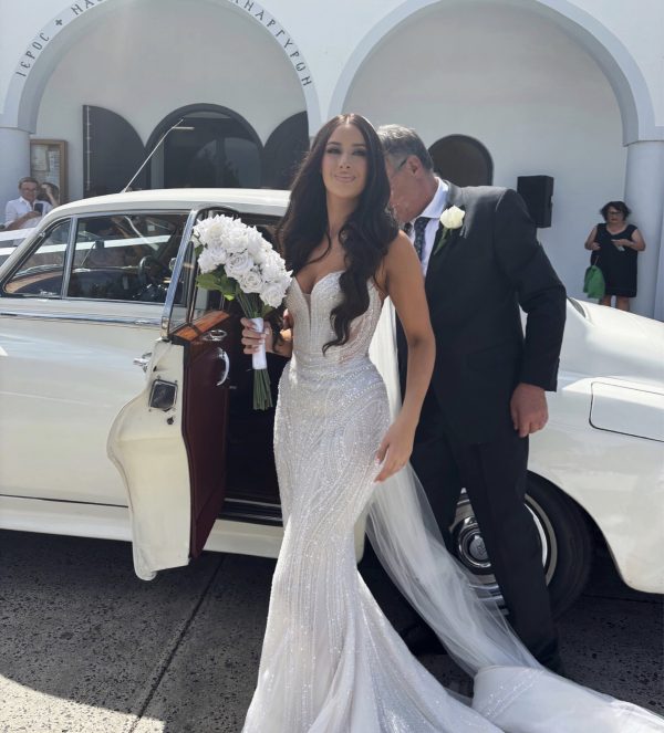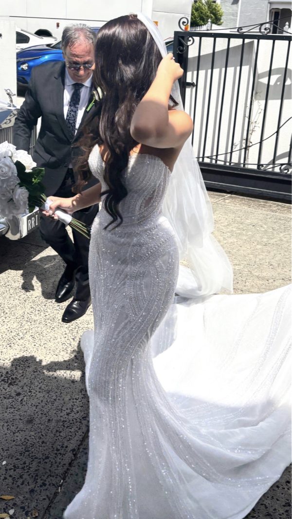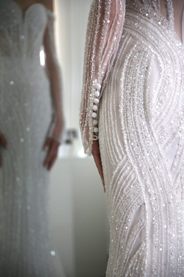 The fully beaded design with pearls and lines on a nude color underlay adds an elegant and delicate touch to the dress. The soft tulle pleats not only add to the feminine aesthetic but also provide a light and airy feel to the gown.